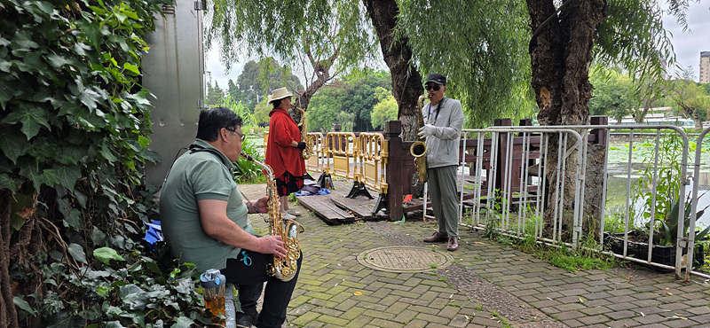 한쪽에 반주기도 없이 색소폰 연주하는 그룹이 있어 잘 통하지 않는 중국어로 소통을 시도하나 잘 안 되네요.