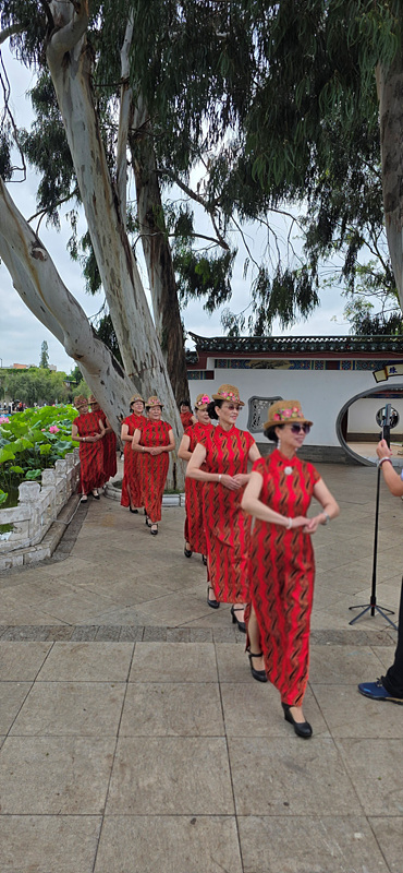중년의 아주머니들이 똑같이 옷을 입고 사진사를 대동하고 사진을 찍네요.